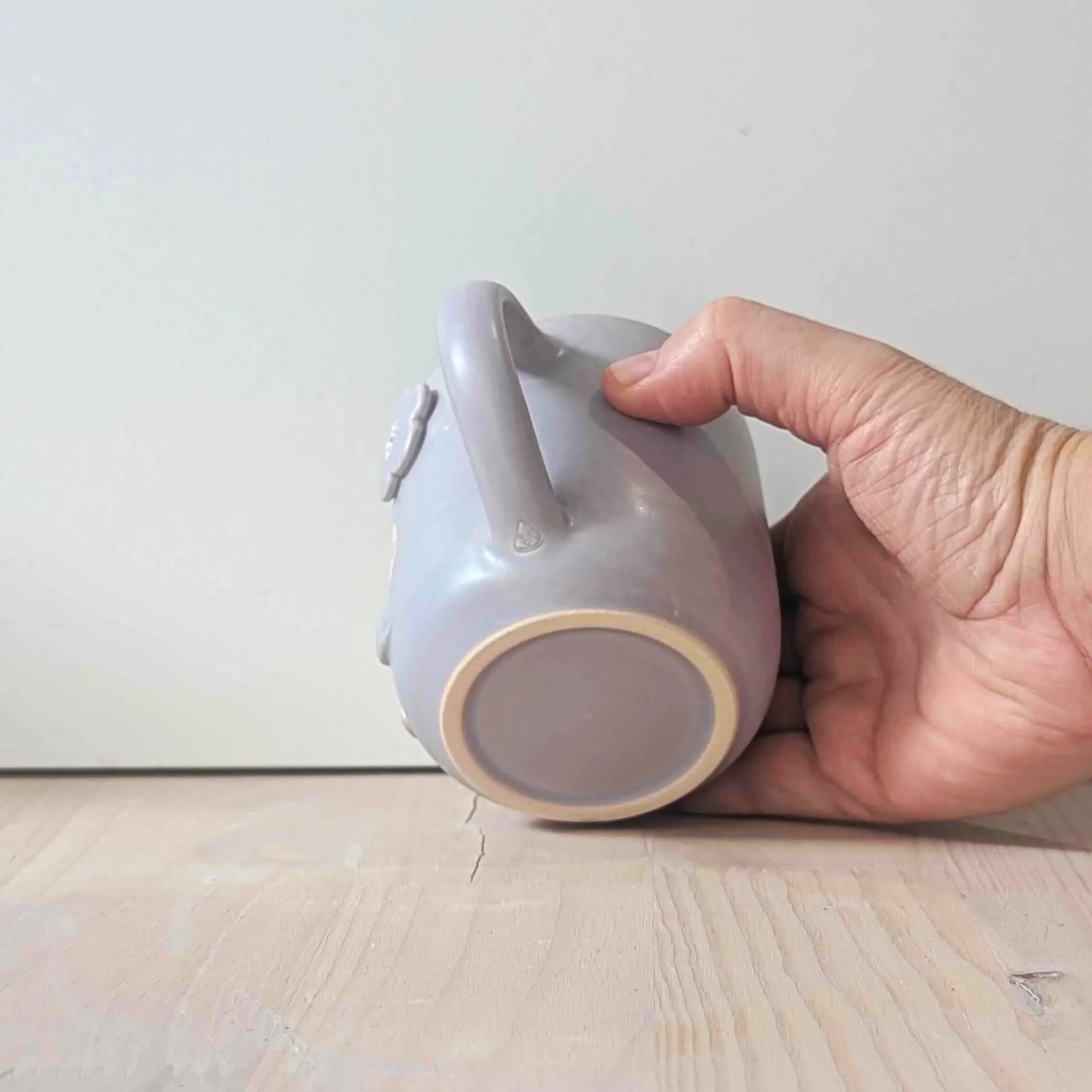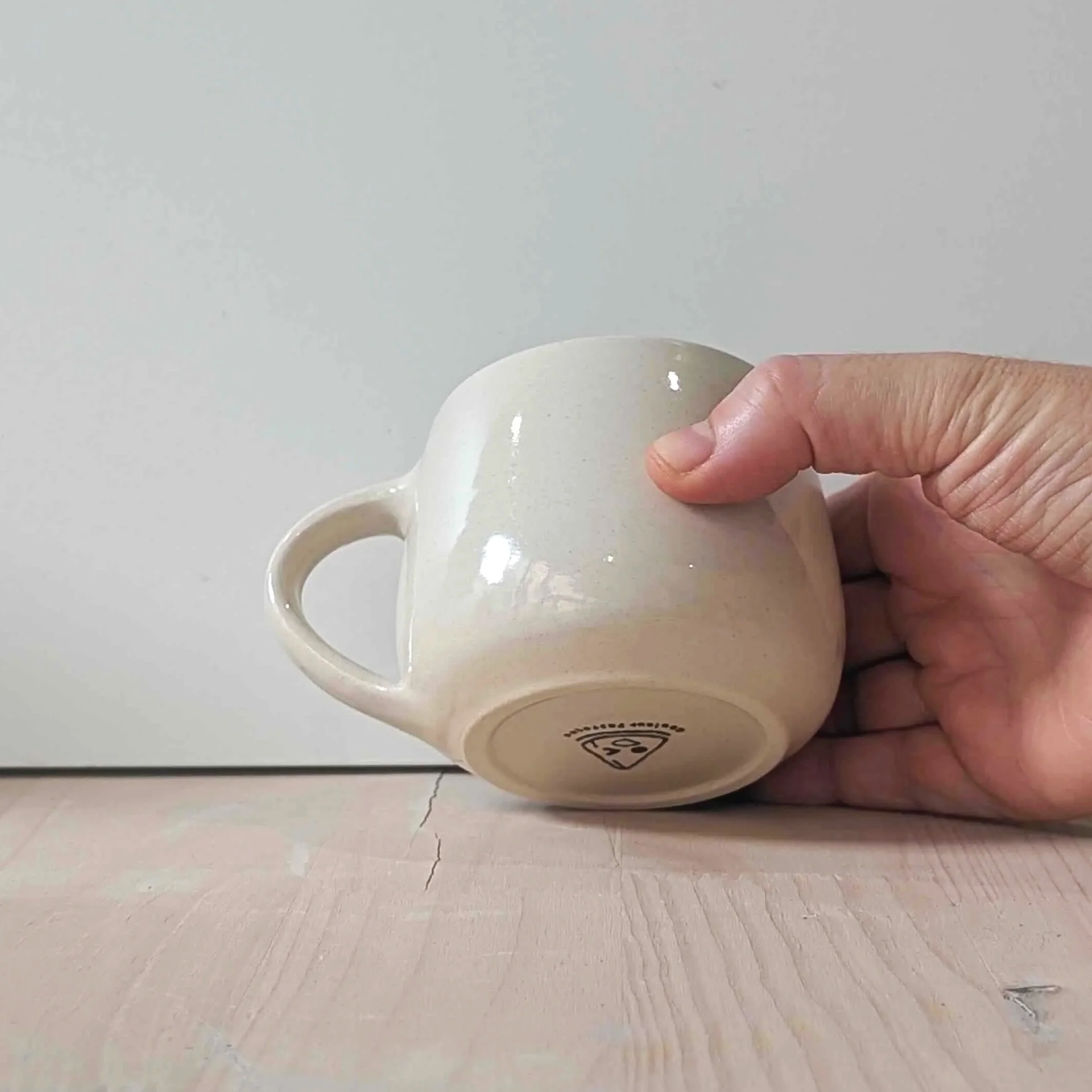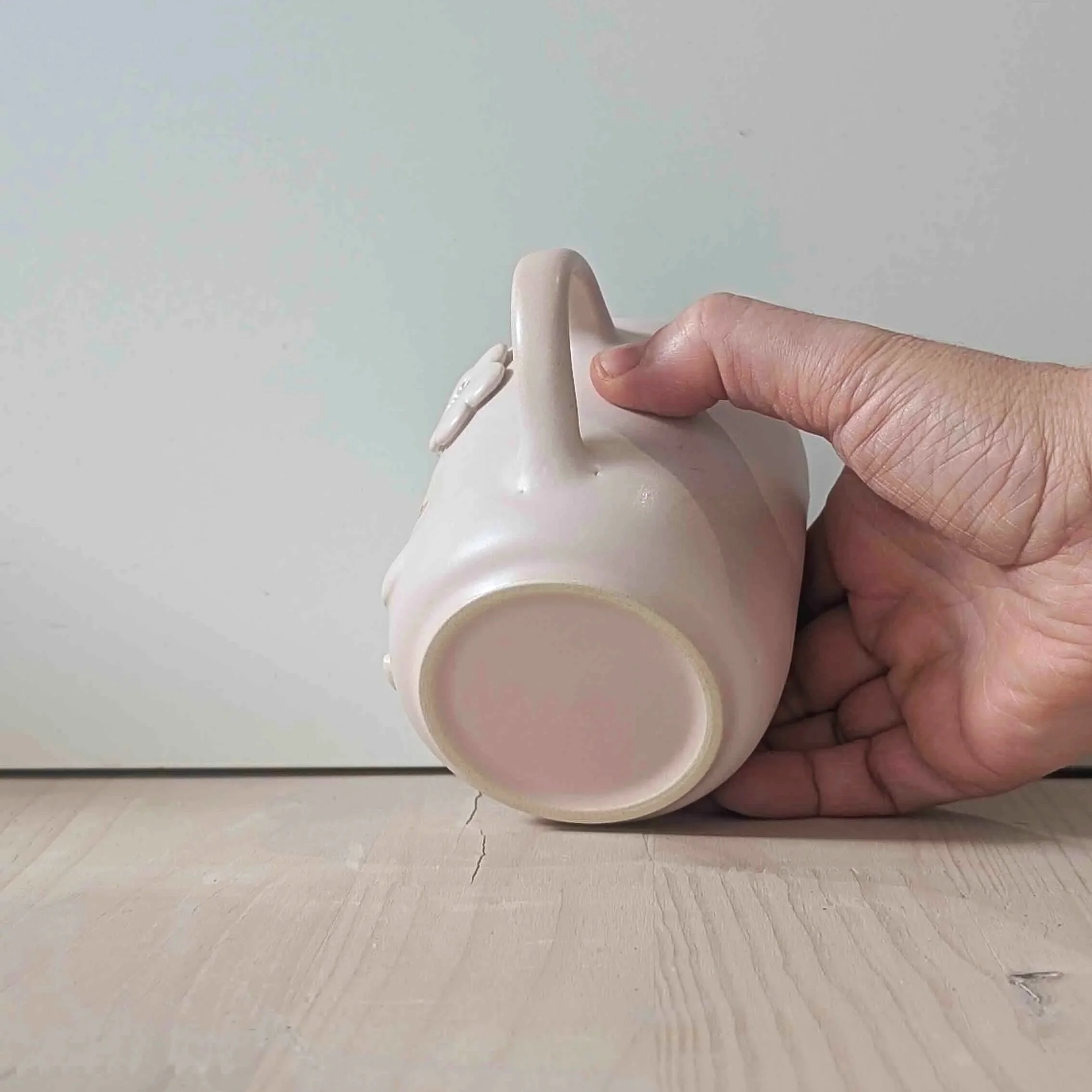 Tasse tournée au tour de potier, modelée et peinte entièrement à la main. Email transparent sur grès blanc. TASSE AVEC ANSE